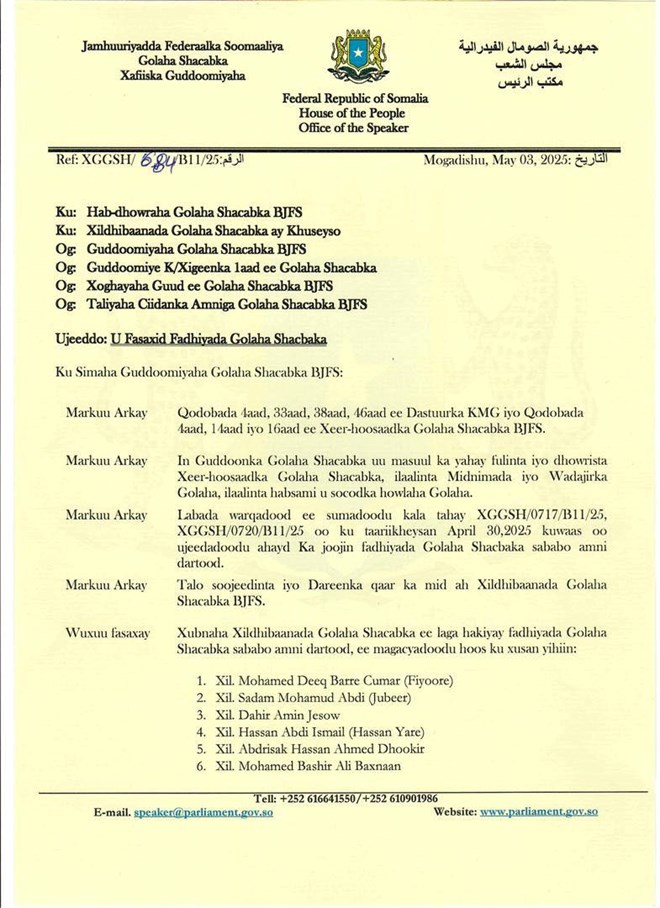 newsinside"Markuu Arkay Labada warqadood ee sumadoodu kala tahay XGGSH/0717/B11/25, XGGSH/0720/B11/25 kuwaas oo ujeedadoodu ahayd Ka joojin fadhiyada Golaha Shacbaka sababo amni dartood iyo Talo soojeedinta iyo Dareenka qaar ka mid ah Xildhibaanada Golaha Shacabka Wuxuu fasaxay Xubnaha Xildhibaanada Golaha Shacabka ee laga hakiyay fadhiyada Golaha Shacabka" ayaa lagu yiri qoraalka Warqada.