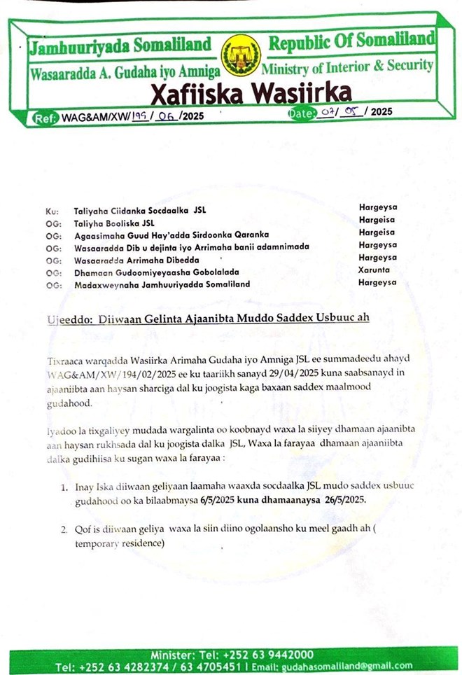 Warsaxaafadeed kasoo baxay Wasaaradda Arrimaha Gudaha Somaliland ayaa lagu amray dhammaan ajaanibta aan sharciga haysanin in ay iska diiwaangeliyaan waaxaha laanta socdaalka. Dadka isdiwaangaliya ayaa la siin doonaan degenaansho.