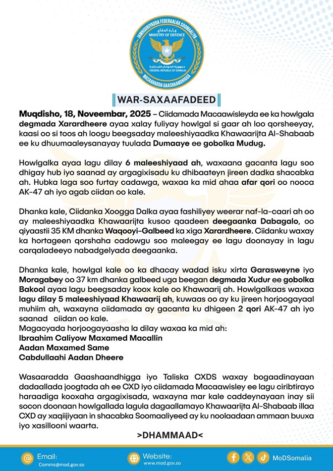 Talaado, November 18, 2025 (HOL) - Wararka ka imanaya gobollada Mudug iyo Bakool ayaa sheegaya in howlgallo ka dhan ah kooxda Al-Shabaab ay ciidamada deegaanka (Mucaawisleyda) iyo kuwa dowladda ku fuliyeen tuulooyin ku yaalla labada gobol.