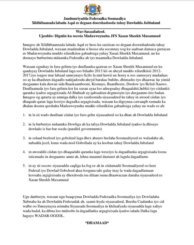 War-saxaafadeedka oo si adag u dhaliilaya Madaxweynaha, ayaa xusay in la helay xog ku saabsan in Xasan Sheekh Maxamuud uu wado qorsheyaal lagu faragelinayo maamulka Jubbaland, taasoo ujeedkeedu yahay in la burburiyo nidaamka dowlad goboleedka Jubbaland.