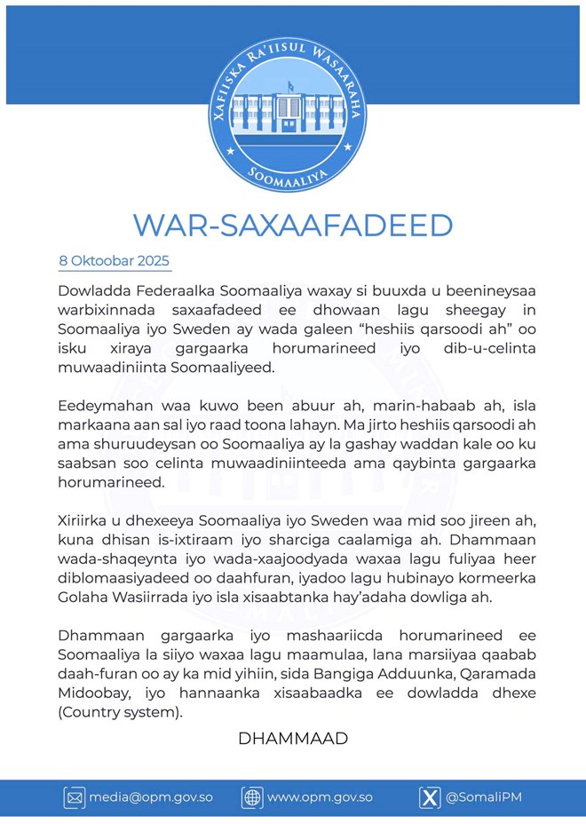 Arbaco, October 8, 2025 (HOL) - Dowladda Federaalka Soomaaliya ayaa si cad u beenisay warar dhawaan lagu baahiyey warbaahinta, kuwaasoo sheegayey in heshiis qarsoodi ah oo ku saabsan kaalmada horumarineed iyo dib-u-celinta muwaadiniinta laga gaartay dalka Sweden, waxaana muran siyaasadeed weyn ka dhex dhalisay siyaasiyiinta Sweden.