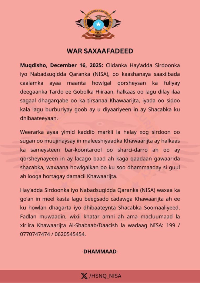 Hoos ka akhriso Warsaxafadeedka kasoo baxay Hay'adda NISA oo dhameystiran: