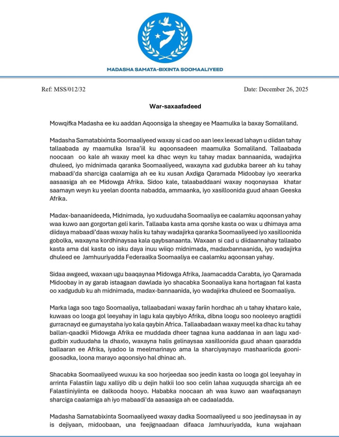 Jimco, December 26, 2025 (HOL) - Madasha Samatabixinta Soomaaliyeed ayaa warsaxaafadeed ay soo saartay ku muujisay diidmo cad oo aan leex-leexad lahayn oo ay ka qabto tallaabada ay ku tilmaantay “aqoonsi sharci-darro ah” oo ay Israa’iil siisay Somaliland, taas oo ay ku sheegtay mid si toos ah u dhaawacaysa madax-bannaanida, midnimada, iyo wadajirka dhuleed ee Jamhuuriyadda Federaalka Soomaaliya.