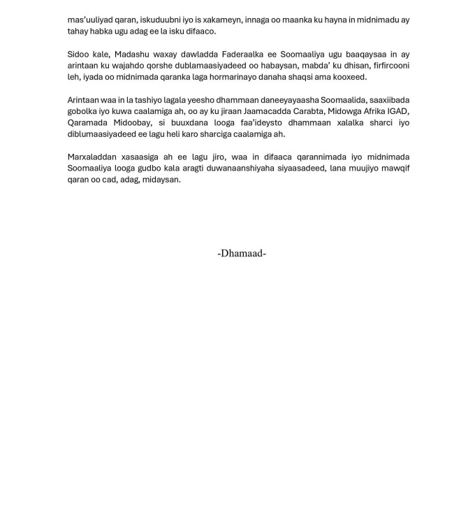 Ugu dambeyn, Madasha Samatabixinta Soomaaliyeed ayaa ugu baaqday shacabka Soomaaliyeed in ay is dejiyaan, midoobaan, kuna wajahaan xaalad mas’uuliyad qaran, halka ay dowladda Federaalka ku boorrisay in ay qaaddo istaraatijiyad diblumaasiyadeed oo mabda’ ku dhisan, kana shaqeysa la-tashi ballaaran oo lala yeesho dhammaan daneeyayaasha gudaha, gobolka iyo caalamka, si loo helo xal sharci iyo diblumaasiyadeed oo waara.