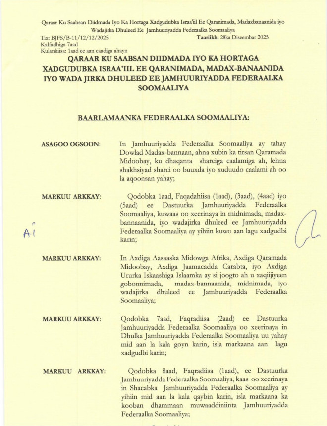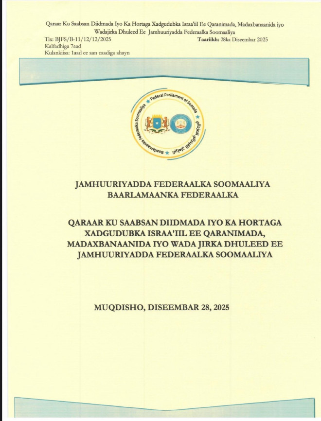 Axad, December 28, 2025 (HOL) - Labada Aqal ee Baarlamaanka Federaalka Soomaaliya ayaa maanta kulan degdeg ah oo wadajir ah ka yeeshay arrinta ku saabsan aqoonsi ay Israa’iil sheegtay inay siisay Somaliland, iyagoo si rasmi ah u soo saaray qaraar adag oo ay ku canbaareynayaan tallaabadaas.
