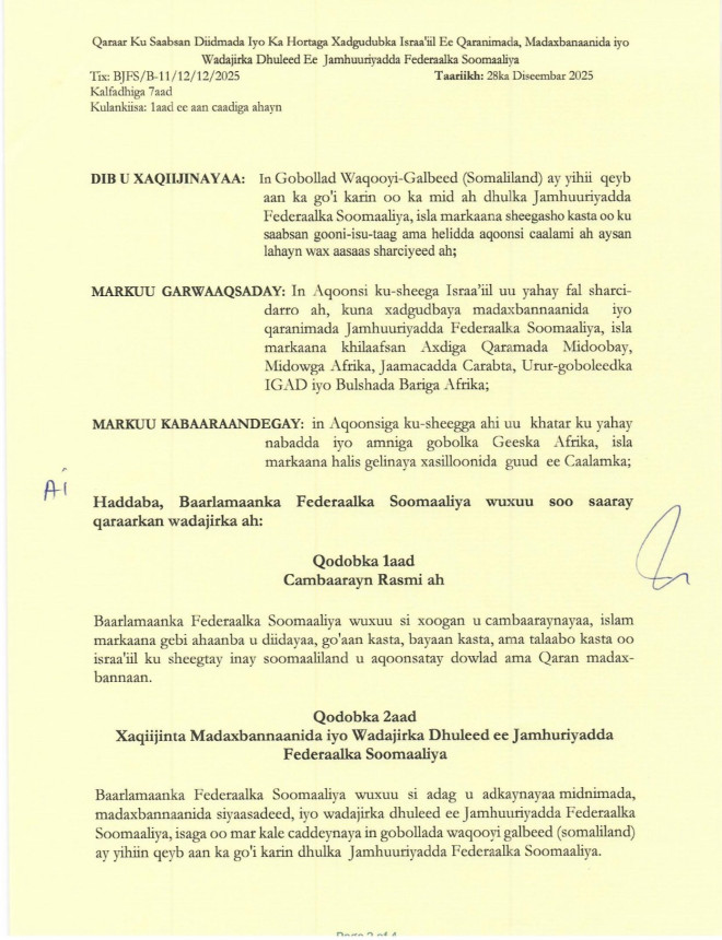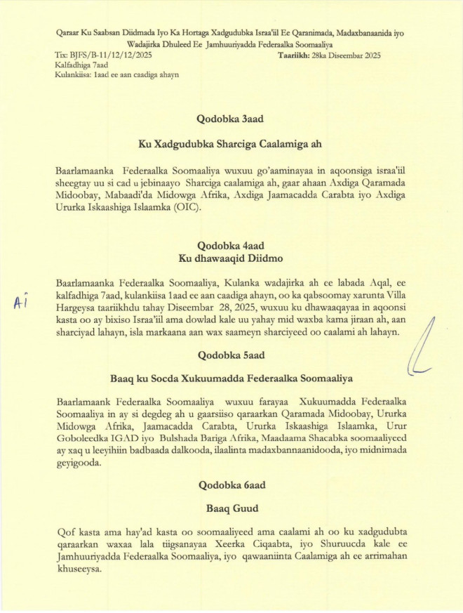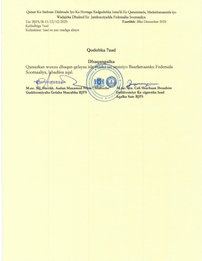 Baarlamaanka Federaalka Soomaaliya wuxuu bayaankiisa ku adkeeyay in tallaabada Israaqiil ay halis ku tahay nabadda iyo amniga Geeska Afrika, isla markaana ay khalkhal gelin karto xasilloonida guud ee caalamka.