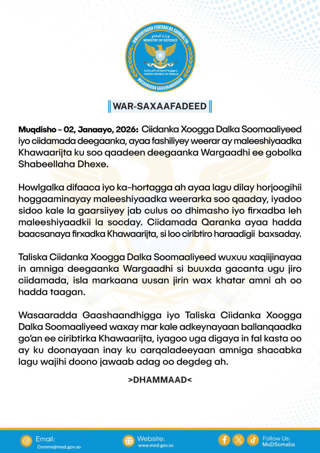 Jimco, January 2, 2026 (HOL) - Wasaarada Gaashaandhiga Soomaaliya ayaa sheegtay in Ciidamada Xoogga Dalka Soomaaliyeed iyo kuwa deegaanka ay fashiliyeen weerar ay Al-Shabaab ku soo qaadeen deegaanka Wargaadhi ee gobolka Shabeellaha Dhexe.
