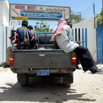 Somalia gunmen sit in their van outside the Mogadishu University Faculty of
