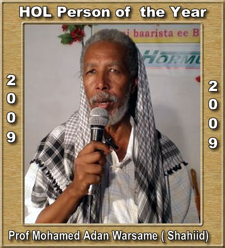 Hiiraan Online recognizes Dr. Shahiid, may Allah bestow his soul in the eternal mercy, as the Person of Year 2009 for his remarkable contribution to the welfare of the ill and others in need; for successfully training dozens of young doctors who are currently serving their people across the nation; for withstanding the savagery of the senseless conflict, and, more importantly, for eventually paying the ultimate price: his life.