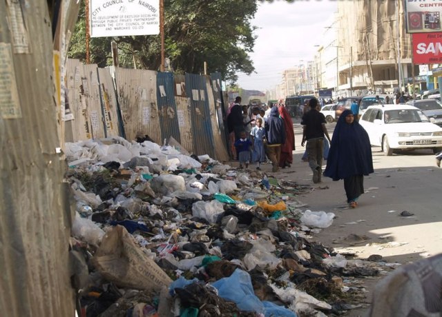 Residents of Eastleigh walk past one of the many roadside dump's in the disctrict - Photo HOL