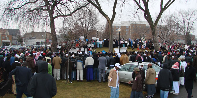 Women wearing colorful garbs and headscarves, and men wearing white robes, held signs that said “No more warlords,” and “Somali-Americans against Ethiopian aggression.”