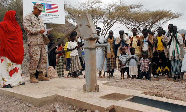 Combined Joint Task Force-Horn of Africa team members speak during a well dedication ceremony at Ad Bouya, Djibouti. The well, which provides clean drinking water to the people and livestock of Ad Bouya, was built by U.S. service members as part of their mission to develop and nurture partnerships and promote regional stability in the Horn of Africa. SOURCE: Master Sergeant Eric Kreps, U.S. Air Force