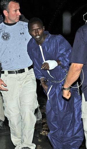 | FBI agents escort Somali pirate U.S. officials identify as Abduhl Wali-i-Musi into FBI headquarters at 26 Federal Plaza, Monday, April 20, 2009, in New York. Abduhl Wal-i-Musi is the sole surviving Somali pirate from the hostage-taking of commercial ship captain Richard Phillips. (AP Photo/ Louis Lanzan |