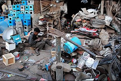 ![]() At the immense workshop called Medeber in Asmara, the Eritrean capital, workers in blue coveralls turn heaps of scrap metal into useful items, such as the blue stoves at left. The national mantra is self-reliance. Even during a hunger crisis and a failing national economy, President Isaias Afwerki shuns most outside aid. (Jeremy Clarke) |