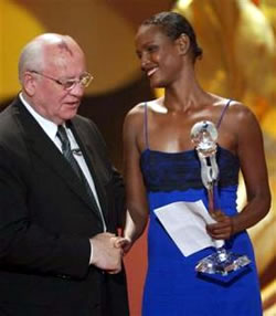 ![]() Waris Dirie from Somalia receives the 'World Socail Award' from the former president of the Soviet Union and president of the World Awards Mikhail Gorbavachev during the Women's World Awards gala in the norther German city of Hamburg June 9, 2004 file photo Credit: Reuters/Christain Charisius |
