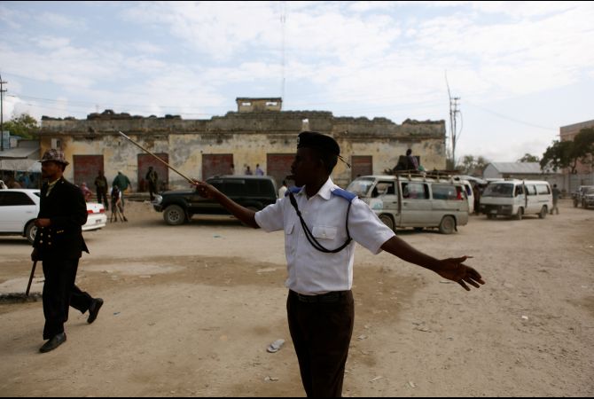 In a sign that a kind of normality is returning to Mogadishu, a traffic policeman directs vehicles at the city's main 'K4' roundabout. (Tristan McConnell/GlobalPost)