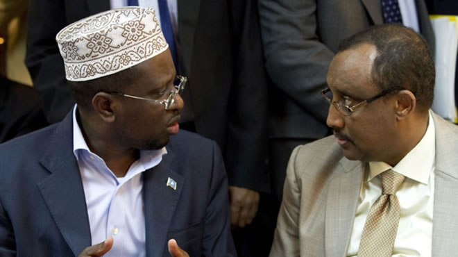 Somalia President Sharif Sheikh Ahmed, left, speaks with Somalia's Prime Minister Abdiweli Mohamed Ali in Nairobi, Kenya on Aug. 4, 2012. (AP / Jacquelyn Martin)