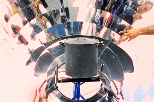 The solar cookers are made of several mirrored panels set together to look like a satellite dish. These panels focus sunlight at the centre of the appliance enabling it to heat a cooking pot or an oven.