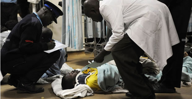 PHOTO | SIMON MAINA | AFP A man is assisted into the hospital on March 10, 2012 after a bomb attack at a bus station in Nairobi that killed at least three people and wounded more than 20 others.