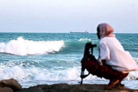 An armed Somali pirate keeps vigil on the coastline at Hobyo, northeastern Somalia, while a hijacked cargo ship is anchored just offshore. But after years of maritime lawlessness, victim nations are fighting back.