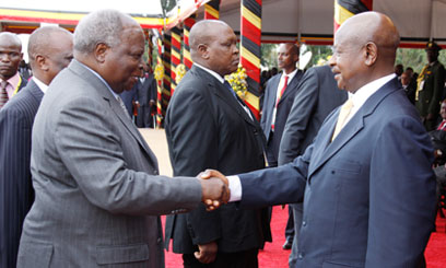 President Kibaki congratulates Yoweri Museveni during celebrations to mark 50 years of Uganda’s Independence/PPS