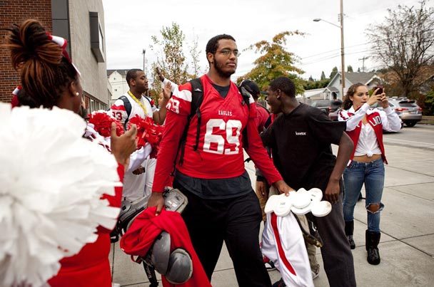 In one of Khalid's first games as a freshman, he squared off against a bigger player from Nathan Hale. The Hale lineman kept grabbing Khalid's face mask and making him shake his head yes or no. Khalid didn't know how to respond to the aggression, so he didn't.