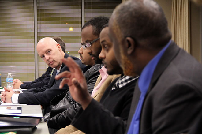 J. Chris Warrner, special agent in charge of the FBI's office in Minneapolis, listens to Imam Hassan Mohamud, right, during a quarterly roundtable community meeting Thursday, Oct. 25, 2012 organized by the Department of Homeland Security. The FBI confirmed this week that two Minneapolis men in July left for Somalia, allegedly to fight for the terror group al-Shabab. The departures were the first public signs that al-Shabab continues to recruit in the U.S. (MPR Photo/Laura Yuen)