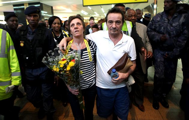 Bruno Pelizzari and Debbie Calitz, the couple that were captured while sailing, arrive back safely at OR Tambo Airport, in Johannesburg, South Africa, after being released by their Somali captors.