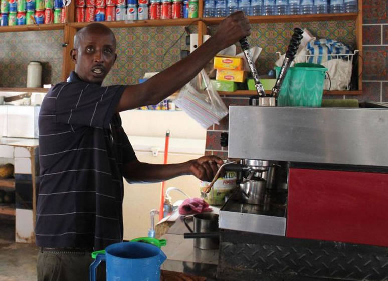 Ahmed Jama in his Village Café, which was blown up this week