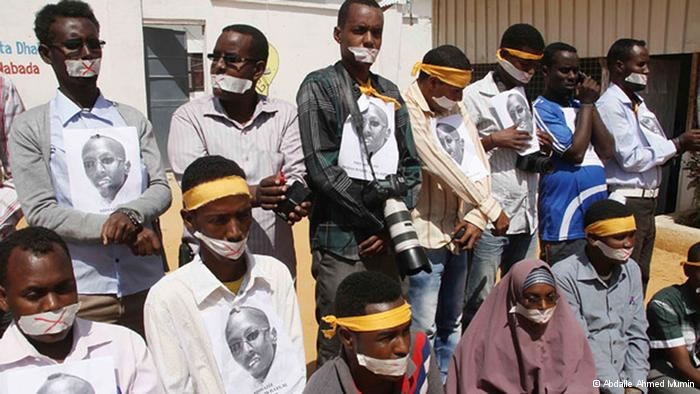 His photograph was taken at a protest held by Somali journalists against the detention and killing of their colleagues. The reporters stand or sit with strips of tape across their mouths, on which they have drawn a large X. The demonstration followed the arrest of a reporter who interviewed a woman raped by government forces. Police officials had claimed the interview was "false" and aimed only to discredit government institutions. In 2012, 18 journalists were killed in Somalia while more than 28 were wounded, making the country one of the most dangerous places on earth to work in the media.