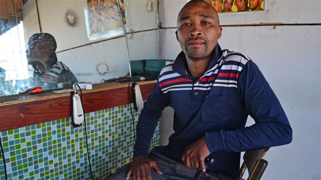 Lufefe Mdunyelwa in his barber shop in Philippi township in Cape Town. Mdunyelwa helped found a local business association that includes South African and foreign business owners © Kristy Siegfried/IRIN
