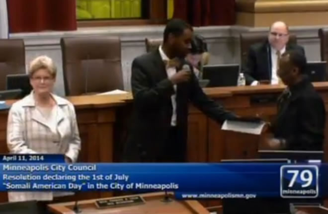 Abdi Warsame, the first Somali-American on the Minneapolis City Council, praised the resolution at a council meeting on Friday. A gathering of Somali-American men were in attendance.