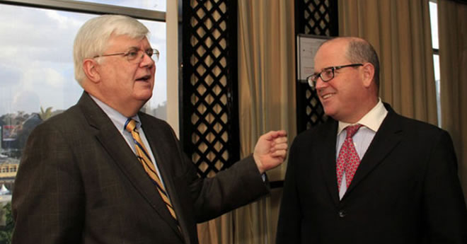 Stephen Hayes (left), President of the Corporate Council on Africa and Mike Blades, regional head of CFC Stanbic East Africa during a past meeting at the Intercontinental Hotel on February 26, 2014 Photo/DIANA NGILA