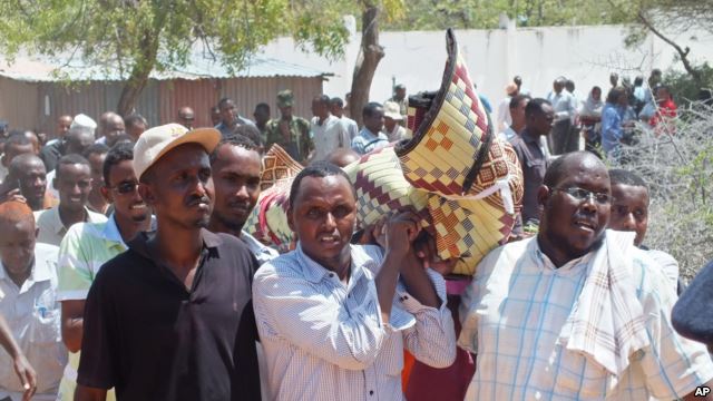 Mourners carry the body of Somali lawmaker Abdiaziz Isaq Mursal for burial in the Somali capital, Mogadishu, April 22, 2014.