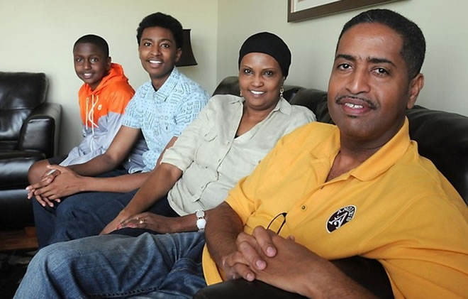 Like many families with Somalian backgrounds, Harbi Hassan and his wife, Nasra Ibrahim, moved to Mankato because they heard it was a safe place to raise children. Their sons, Mahamed, foreground, and Liban are sitting with them. Photo by Pat Christman