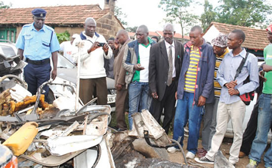 Police and the public inspect the wreckage of the vehicle that exploded near Pangani Police Station. Abdul Hajira, one of the suspects who died in the explosion was son to a Kenya Defence Forces soldier. [PHOTO: FILE/STANDARD]