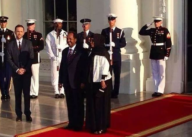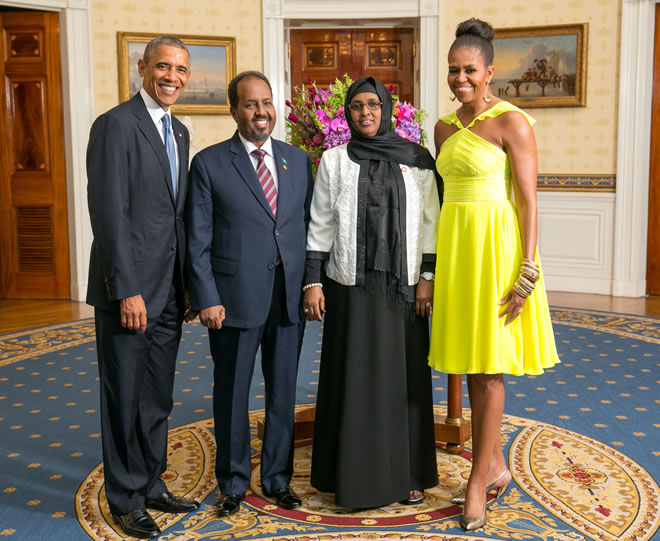 Somali President Hassan Sheikh Mohamud and his spouse, Sahro Cumar Xasan, arrive at the North Portico of the White House in Washington for a gala dinner. Picture: Michael Reynolds