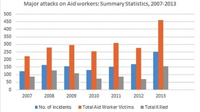 Adapting and adjusting to limit these risks is key, according to theHumanitarian Outcomes’ report accompanying the latest statistics. Among the key findings is the high number of attacks on NGO workers on the move. While vehicles have long been more susceptible to attack than armed compounds, more than half of the violent incidents in 2013 occurred in the context of an ambush or roadside attack.