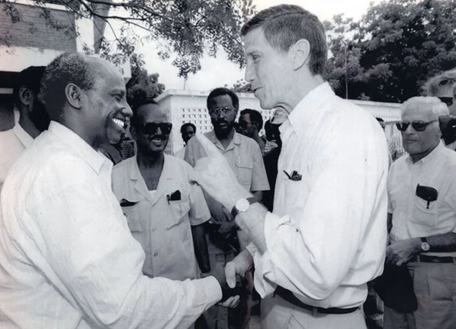 Robert B. Oakley, right, in Mogadishu, Somalia, in January 1993 with Mohammad Farah Aideed.