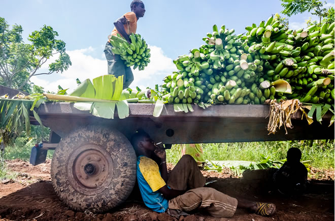 When the trailer is piled high with bananas, it is pulled by tractor to a nearby warehouse, where the fruit is sorted and boxed for transport to destinations across Somalia and as far away as the Middle East.