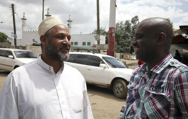Clive Wanguthi (R), a Muslim leader, talks to a man near a mosque in Muslim-dominated Eastleigh neighbourhood in Kenya's capital Nairobi December 9, 2014.