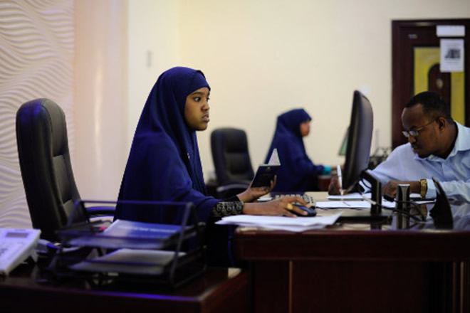 An employee of the International Bank of Somalia helps a new customer set up a bank account at their central headquarters in Mogadishu on November 16, 2014. [AMISOM Photo]