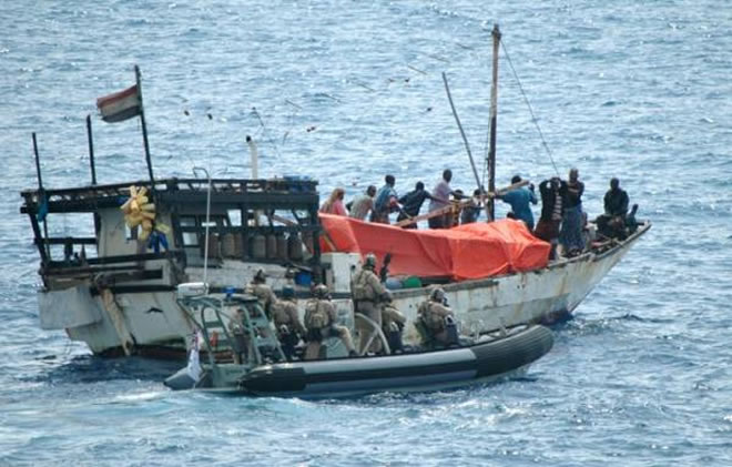 A boarding party from HMAS Stuart coming alongside a dhow which had been seized by Somali pirates at sea off the Horn of Africa. Four hostages and seven pirates died when a pirate ship sank in the Gulf of Aden. Picture: AFP