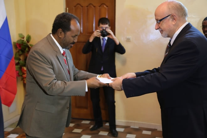 The announcement was made by Russia’s new ambassador to Somalia Mr. Valery Orlov after handing over his credential letters to the president of the federal republic of Somalia Hassan Sheik Mahmoud in a ceremony at the Presidential palace in Mogadishu on Monday.