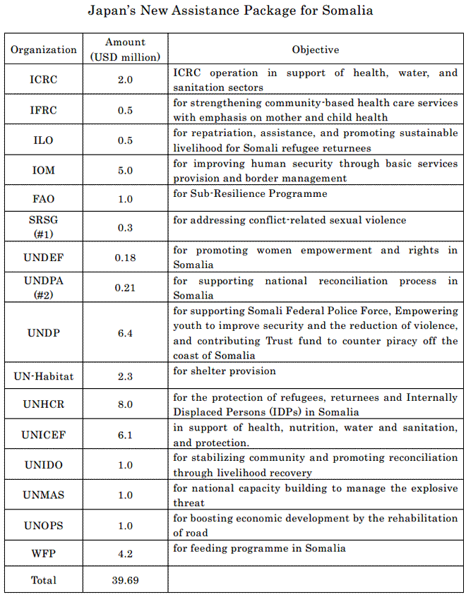 In addition, Prime Minister Abe announced Japan’s decision to resume the Grant Assistance for Grassroots Human Security Projects (GGP) in Somalia.