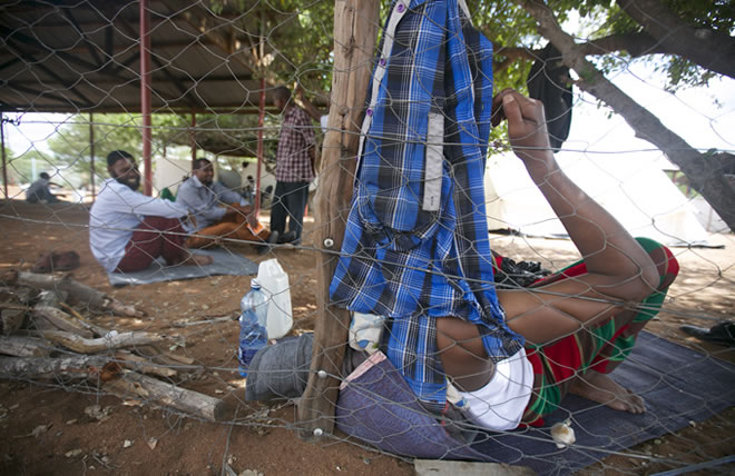 Sitting near the entrance of the compound on a wooden bench, Celestine Frank Joko, a citizen of Cameroon, eats boiled rice and drinks water.