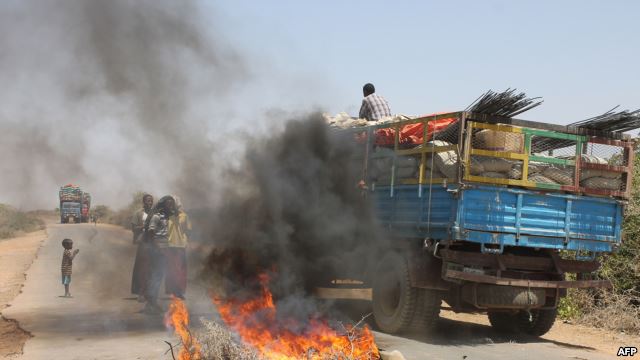 A truck passing a partial roadblock setup by residents as a protest against the Islamist Al-Shabab insurgent group, in Tobanka Buundo in the lower Shabelle region, near the Somalian capital Mogadishu, March 6, 2014.