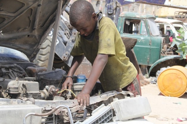 11-year-old Hassan Abdullahi Duale works 12-hour shifts at a car-repair shop in Somalia’s capital Mogadishu. Credit:Alinoor Salad/IPS