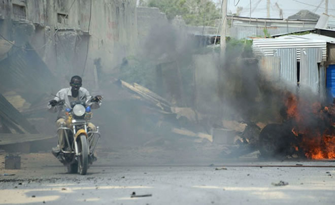 A man rides a motorbike past a burning car shortly after it exploded on February 13, 2014 in Mogadishu. Somalia's Al-Qaeda linked Shabaab vowed Thursday to move their war to neighbouring Kenya. AFP PHOTO / MOHAMED ABDIWAHAB