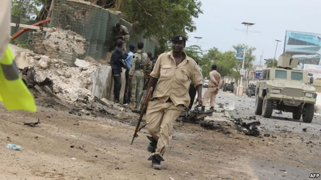 Somali security forces take position on May 24, 2014 in Mogadishu after an attack on the national parliament.